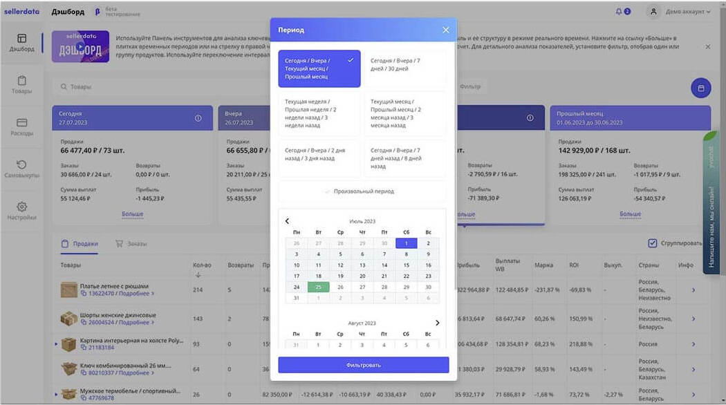 Для сравнения данных из отчета с показателями нашего сервиса, в вашем личном кабинете sellerdata.ru сформируйте отчет за необходимый диапазон дней в Дэшборде при помощи фильтра по периодам и указания дат в опции «Произвольный период».