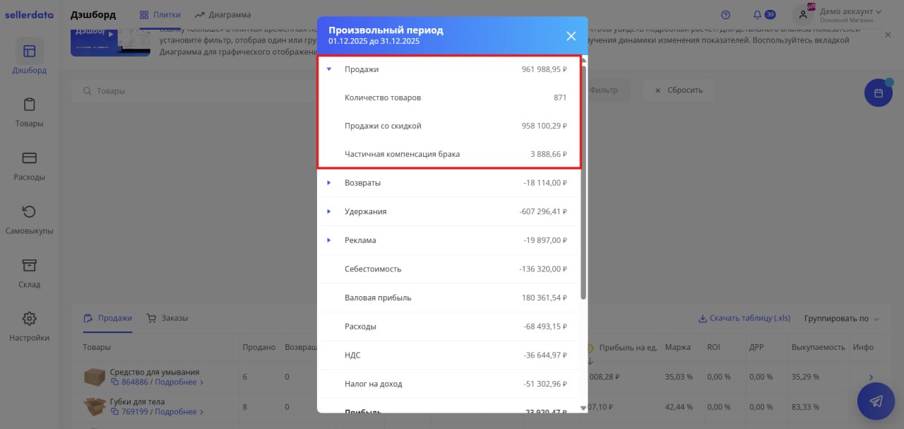 Сверьте сумму по продажам из плашки сводных данных за выбранную неделю в sellerdata с данными из отчета по детализации продаж в колонке «Цена розничная с учетом согласованной скидки». Далее сравните колонку «Кол-во» в отчете по детализации продаж с количеством продаж в плашке сервиса sellerdata. Важно иметь ввиду, что количество товара в sellerdata включает в себя также компенсации ущерба или добровольные компенсации.