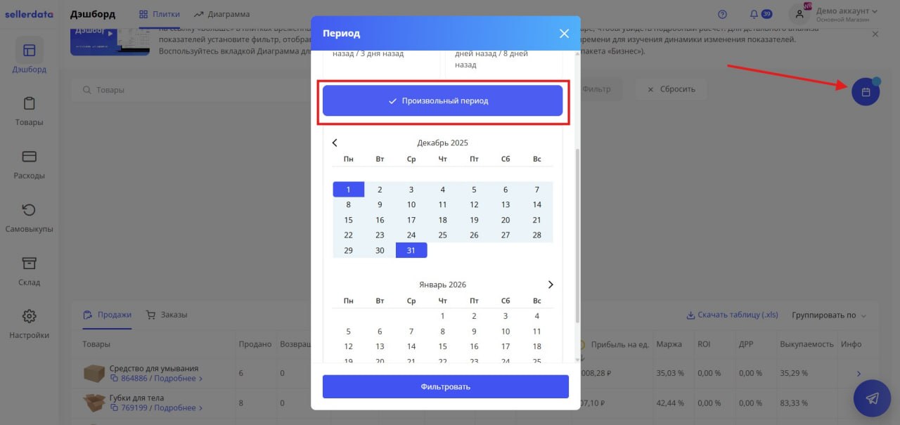 Настройте фильтры по колонкам для удобства отбора нужных типов транзакций. Отфильтруйте колонки Тип документа и Обоснование для оплаты по статье Продажа, Корректная продажа и Сторно возвратов (если есть). В вашем личном кабинете sellerdata сформируйте отчет за аналогичную неделю в Дэшборде при помощи фильтра по периодам и указания дат в опции «Произвольный период».