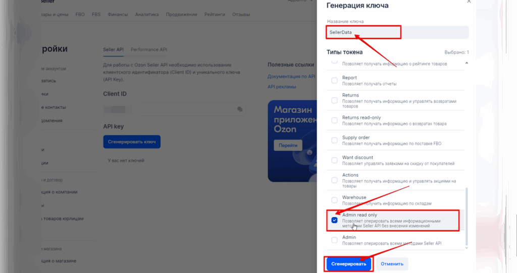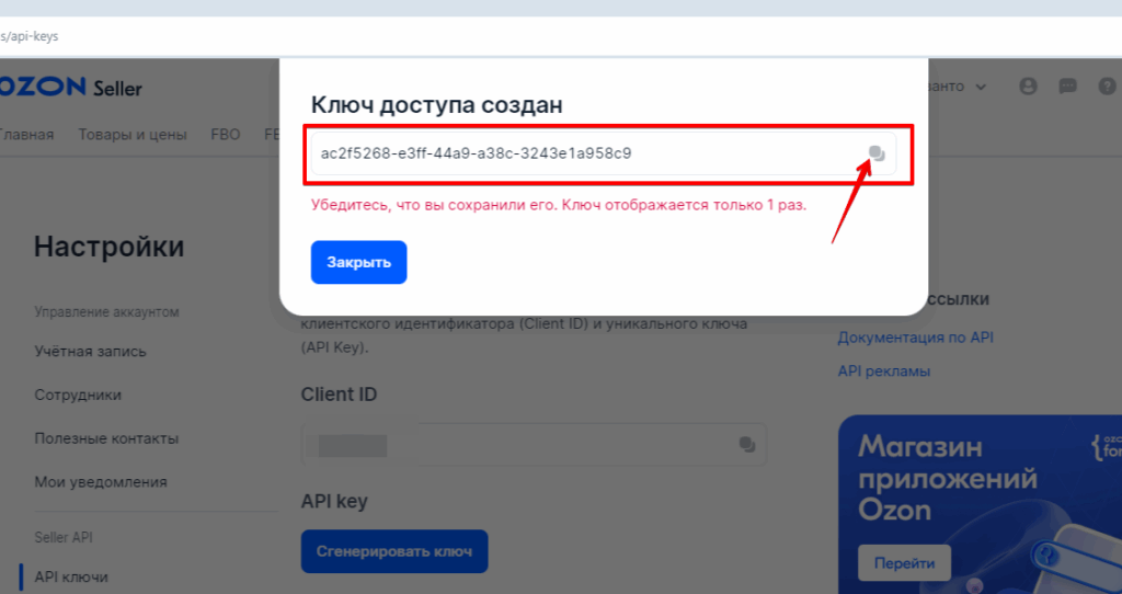 Скопируйте созданный ключ и внесите его в поле ниже на этой странице, чтобы подключить API Ozon Seller к Sellerdata.