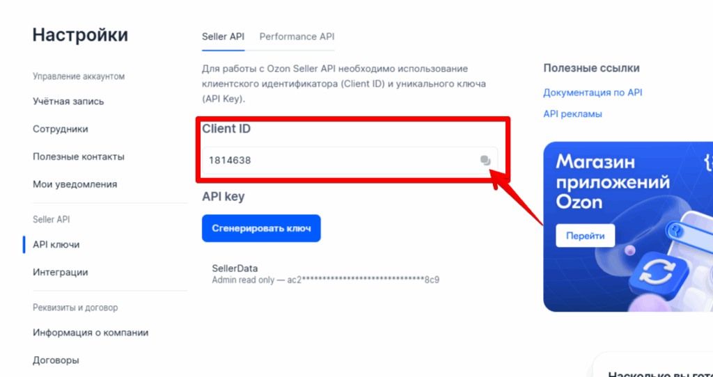 Чтобы подключить API Ozon Seller к Sellerdata также необходимо скопировать клиентский идентификатор (Client ID).