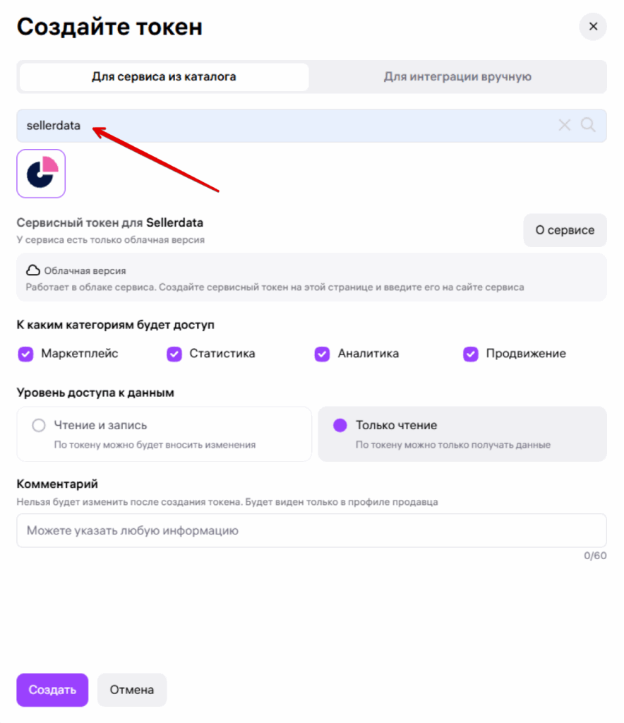 В списке сервисов выберите sellerdata – для удобства воспользуйтесь поисковой строкой. Все необходимые параметры ключа будут настроены автоматически. Нажмите кнопку «Создать токен».