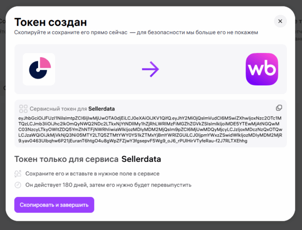 Скопируйте созданный ключ и внесите его в поле ниже на этой странице, чтобы подключить API Wildberries к sellerdata.