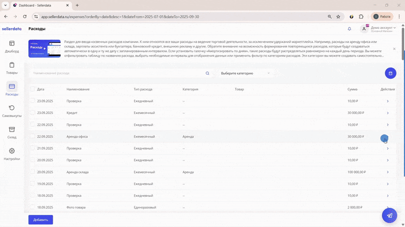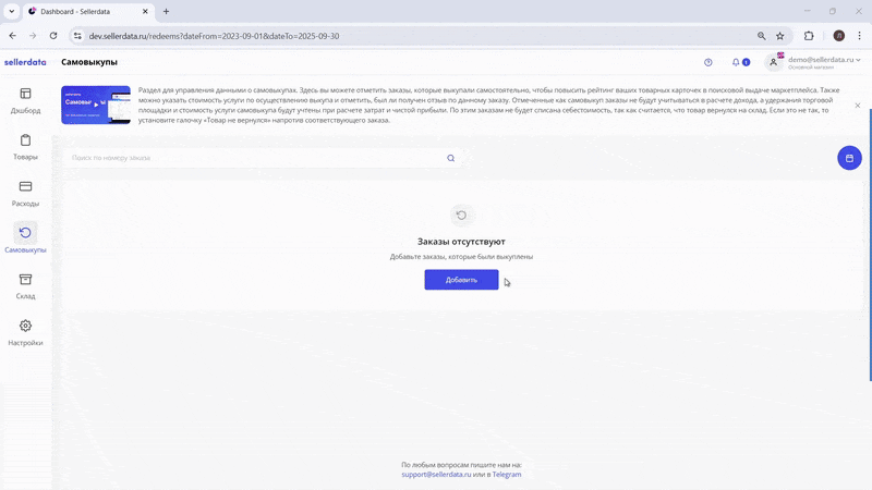 Мы сделали работу с самовыкупами более удобной. Теперь при добавлении можно выбрать период заказа в календаре, что упрощает поиск нужного заказа. Вместо номера заказа используется идентификатор srid — его легко найти в чеке покупателя, а также в одноименной колонке в детализации еженедельного отчета Wildberries или в отчете Озон о начислениях, из раздела Экономика магазин, колонка Номер отправления. В удержаниях самовыкупов теперь учтены расходы на хранение и платную приемку, а самовыкупы, которые были возвращены, будут иметь специальную отметку с датой возврата — это помогает контролировать работу сотрудников и избегать ошибок.
