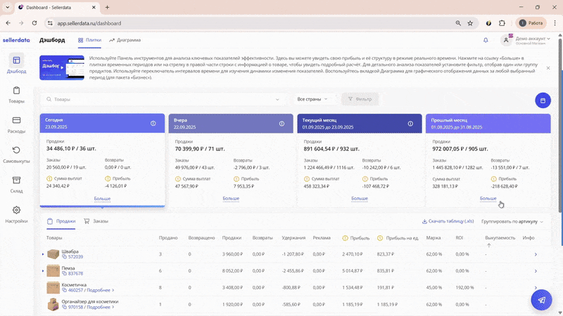Все новые типы операций автоматически распознаются и корректно отражаются в параметрах Удержания – Хранение, Удержания – Реклама и Удержания – Прочие в детализации плашек раздела Дэшборда.
